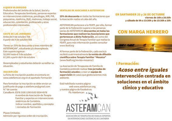 La Asociación de Terapeutas de Familia y expertos en Intervenciones Sistémicas de Cantabria celebrará el 25 y 26 de Octubre un titulado: «Acoso entre iguales. Intervención centrada en soluciones en el ámbito cínico y educativo» impartido por Marga Herrero.