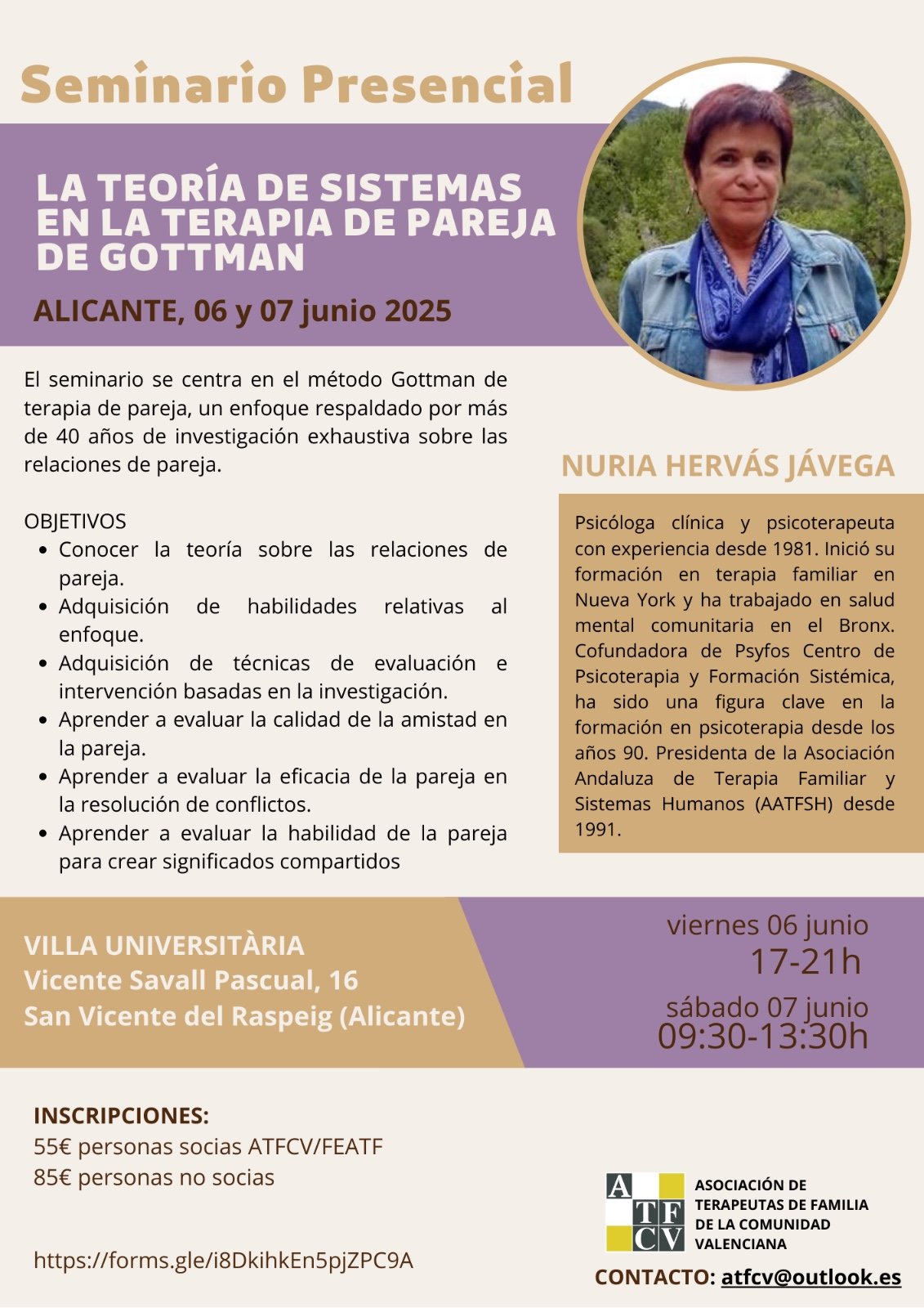 Asociación: AMTPFOSH Asociación Madrileña de Terapia de Pareja y Familia Formación: Intervención en procesos de divorcio Ponente: Fátima Gallardo Duración: 4 horas ( con breve