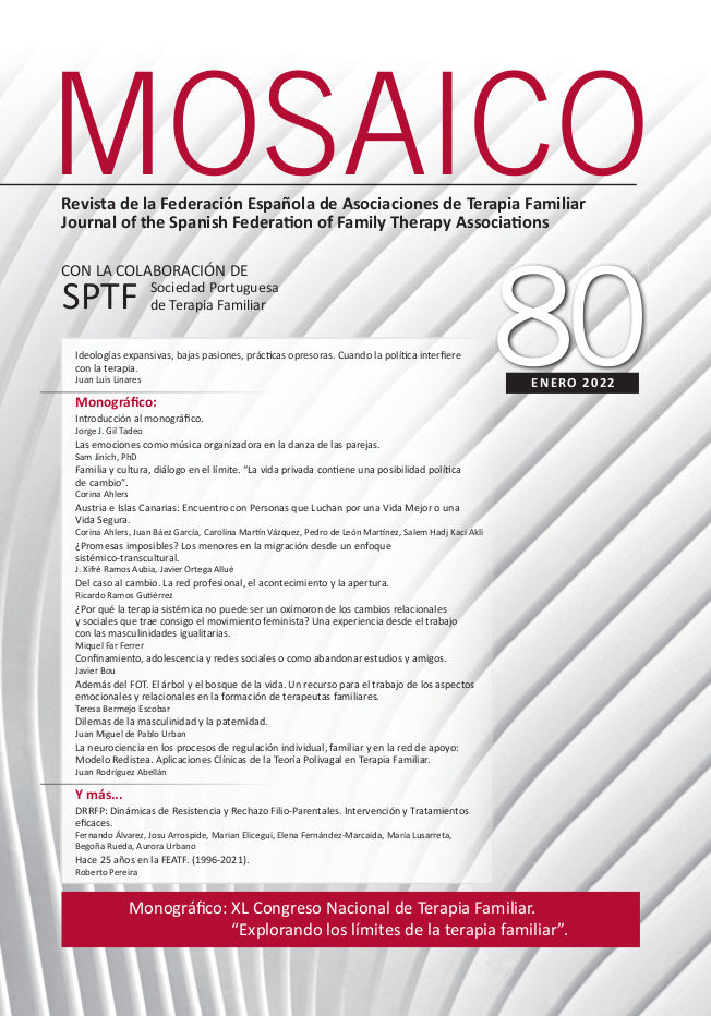 MOSAICO ha crecido en paralelo al desarrollo que, imparable, ha tenido la terapia familiar en nuestros dos países. Cuando parecía que la pandemia, que aún habita entre nosotros, detenía nuestras vidas en un enclaustramiento no sólo físico, sino también mental, las circunstancias han venido a recordarnos la fragilidad de tantas cosas que dimos por supuestas: que la vida discurría por cauces previsibles, que lo conquistado no se podía perder, que la mayoría de nosotros, hombres y mujeres que trabajamos en contextos de incertidumbre y de sostén, íbamos a tener la fortaleza suficiente como para mantenernos incólumes ante altos niveles de ansiedad, tristeza o sufrimiento. Esta situación está poniéndonos a todos a prueba. Como un peligro que hemos de afrontar y una oportunidad que acaso nos ayude a crecer y quizás a ser mejores como personas y también como profesionales. A la par que nos muestra la necesidad imperiosa de reconocer nuestra mutua interdependencia y que la suma del conjunto del sistema es mayor que la de sus partes aisladas, empujándonos a trabajar de otro modo, nutriéndonos de las experiencias de otros y también de su sabiduría y experiencia.